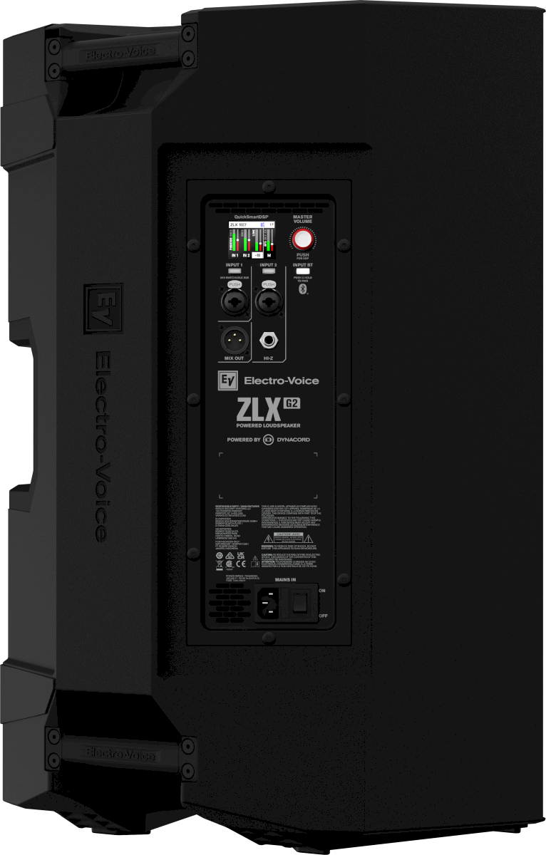 Aktywne modele ZLX G2 są zasilone elektroniką marki Dynacord – siostrzanego brandu Electro-Voice. Ultrawydajne wzmacniacze klasy D o mocy 1000 W są zintegrowane z czterokanałowym mikserem cyfrowym z wysokiej jakości procesorem efektów. Mikser wyposażono w dwa gniazda combo XLR/TRS (w tym jedno z zasilaniem Phantom) oraz wejście Hi-Z, które pozwala na podłączenie instrumentu bezpośrednio, bez konieczności użycia Di-box-a. Na pokładzie znajdują się również profesjonalne narzędzia, takie jak rozbudowane EQ, automatyczne tłumienie sprzężeń, ducking, kompresja oraz presety brzmieniowe dla instrumentów i mikrofonów.