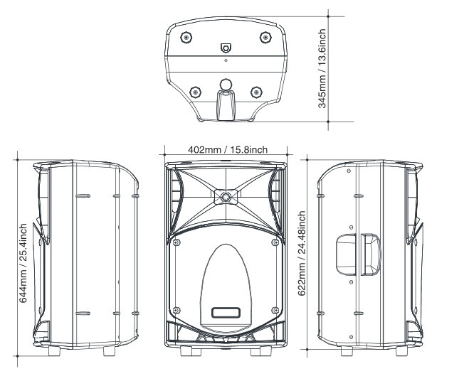 Cechy:2-drożna konstrukcja bass-reflex w systemie bi-amp700W RMS LF, 200W RMS HF, wzmacniacze klasy D z przełącznikiem zasilaniaDSP z czterema presetami EQPanel sterowania z wejściem XLR, XLR LINK, regulacją głośności, presetami EQ, filtrem górnoprzepustowym, przełącznikiem ground/liftDwa punkty M10 do zawieszenia kolumny, wejście statywu 35mm, wspornik do montażu na ścianiePokrycie 90°H x 60°VMożliwość ustawienia pod różnymi kątami: 12°, 40° lub 55°Specyfikacja:Konfiguracja: 2-drożnaWbudowany wzmacniacz LF/HF: 700/200 W RMS (1400/400W peak)Pasmo przenoszenia: 45Hz – 20KHz -6dBGłośnik niskotonowy: 14″ – 2,5″ cewkaGłośnik wysokotonowy: 1″ – 1,4″ cewkaMaksymalny poziom ciśnienia akustycznego: 126 / 132dBPokrycie: 90° x 60° HxVImpedancja wejściowa: 22KohmCzęstotliwość graniczna: 1,6KHzZasilanie AC: 640VAWejście: XLR z pętlą, Jack 6,3mmPrzewód zasilający: 5mWymiary: 402x644x345mmWymiary transportowe: 500x745x440mmWaga: 14kgWaga transportowa: 16,6kg