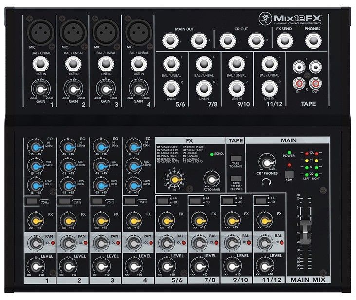 12 kanałowy kompaktowy mikser audio, 4 wejścia mikrofonowo liniowe, 3 pasmowy EQ, filtr górnoprzepóstowy (75Hz), komntrola Panoramy, lkontrola poziomu sygnału, zasilanie Phantom, 4 wejścia stereo 1/4″, 12 programowy procesor efektów, Wejscie/wyjście stereo RCA dla polaybacku i nagrywania, 60mm suwak do kontroli poziomu wyjścia głównego Main L/R, Wyjście słuchawkowe i Control Room z kontrolą poziomu, Wymiary : 53 x 297 x 244 mm, Masa 1,7 kg