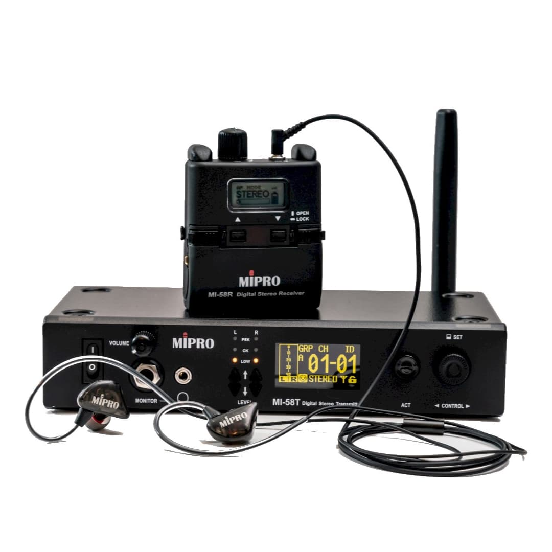 Kluczowe cechy bezprzewodowego systemu odsłuchu IEM Mipro MI58 SET Cyfrowy system bezprzewodowy odsłuchu osobistego IEM tajwańskiej firmy MiproPracuje w paśmie ISM 5,8 GHz dzięki czemu może pracować bez przeszkód całym świecieOdbiornik może pracować w trybach Stereo / Mono / MixedNadajnik wyposażony jest w graficzną diodę OLED, pokrętło, przycisk synchronizacji ACTSłuchawki zapewniają doskonałą izolację, zrównoważony, pełnozakresowy dźwiękW zestawie znajduje się inteligentna ładowarka jednoslotowa Ogólny opisTytułem wstępu o systemiMipro MI-58 SET to cyfrowy bezprzewodowy system monitorów dousznych, który działa w wolnym od licencji paśmie częstotliwości 5,8 GHz. Szerokie pasmo przenoszenia zapewnia rozszerzoną odpowiedź częstotliwościową od 20 Hz do 23 kHz, wysoki stosunek sygnału do szumu, niskie opóźnienia i znacznie lepszą, pozbawioną szumów jakość dźwięku niż jest to możliwe w przypadku systemów analogowych w zakresie UHF.Atrakcyjny stosunek ceny do jakościDzięki bardzo atrakcyjnej cenie i wysokiemu poziomowi jakości, system cyfrowych bezprzewodowych monitorów dousznych MI-58 osiąga bezkonkurencyjny stosunek ceny do jakości. Dodatkowa opcja zintegrowanego interfejsu DANTE pozwala na bezpośrednie wprowadzenie cyfrowych sygnałów audio.Idealny zestaw do pracyCyfrowy bezprzewodowy system monitorów dousznych MI-58 SET składa się z wytrzymałego, stacjonarnego nadajnika stereo MI-58T oraz bardzo poręcznego odbiornika bodypack MI-58R. System ten jest w stanie precyzyjnie napędzić nawet bardzo wysokiej jakości słuchawki, zapewniając najlepsze możliwe wrażenia dźwiękowe. Przyjazne dla użytkownika sterowanie i duży zakres transmisji ułatwiają codzienną pracę z tym systemem w sali prób, jak również na małych i dużych scenach.Nadajnik MI-58TMipro MI-58T jest wyposażony w graficzną diodę OLED, pokrętło, przycisk synchronizacji ACT, przycisk ustawiania wejścia audio oraz pierwsze w branży wskaźniki LED do wyraźnej identyfikacji głośności wejścia, aby zapobiec przesterowaniom. Posiada podwójne złącza monitorowania słuchawek Ø 3,5 mm i Ø 6,3 mm oraz indywidualne regulatory głośności. Na tylnym panelu MI-58T znajdują się dwa wejściowe gniazda combo XLR i Ø 6,3 mm, dwa wyjścia pętlowe jack telefoniczny Ø 6,3 mm, interfejs sieciowy ACT-BUS, złącza wyjściowe TNC RF oraz zasilacz DC 12 V.Poza tym, MI-58T dostarcza < 25 mW mocy wyjściowej (maksymalna wartość zależy od przepisów telekomunikacyjnych w różnych krajach) z przełącznikiem ON / OFF. Ustawia kilka kanałów wolnych od zakłóceń i może ACT™ synchronizować się z odbiornikiem. Z wysokim zakresem dynamiki wejścia stereo combo jack, może utrzymać maksymalne wyjście z każdego miksera.Odbiornik MI-58RMipro MI-58R posiada tryby wyjścia Stereo / Mono / Mixed oraz ustawienia EQ, aby dost
