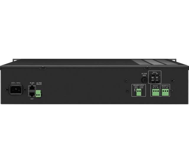 Cyfrowy (klasa D) wzmacniacz PA Wzmacniacz PA-1250D reprezentuje nową generację urządzeń, charakteryzujących się dużymi zdolnościami mocowymi przy niskich kosztach użytkowania oraz dłuższą żywotnością. W porównaniu z analogowymi wzmacniaczami 100V o efektywności na poziomie 70%, osiąga wartość powyżej 90%. Ponadto, dzięki małej emisji ciepła, praktycznie nie wymaga chłodzenia. Wzmacniacz cyfrowy (klasa D) PA, mono, 250WRMS, energooszczędny. Klasa D o wysokiej efektywności (redukcja kosztów zasilania) Funkcja oszczędzania energii: automatyczne przechodzenie w tryb standby w przypadku braku sygnału na wejściu (ponowne włączenie po pojawieniu się sygnału) Wymaga mniejszych pojemności akumulatorów do zasilania awaryjnego niż analogowe wzmacniacze 100V Obniżone wymaganie chłodzenia dzięki małej emisji ciepła Cicha praca dzięki chłodzeniu bez wentylatora; idealne rozwiązanie dla biur, sal konferencyjnych, kościołów Specjalne obwody zabezpieczające przed zwarciem, spadkiem napięcia i przegrzaniem Rozbudowane menu sterujące, wyświetlacz LCD Port RS-485 do zdalnego sterowania Włączany filtr górnoprzepustowy 200Hz, 6dB/okt. Dodatkowe wejście priorytetu Zasilanie sieciowe lub awaryjne 24V