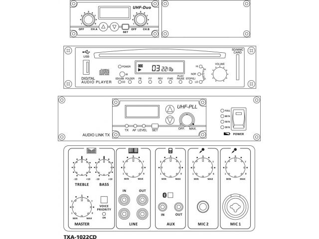 Zintegrowany w TXA-1022CD nadajnik wysyła sygnał audio do jednego lub kilku systemów TXA-1020. Zastosowanie wewnątrz obszernych pomieszczeń wymagających pełnego pokrycia dźwiękiem.