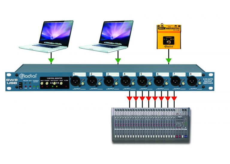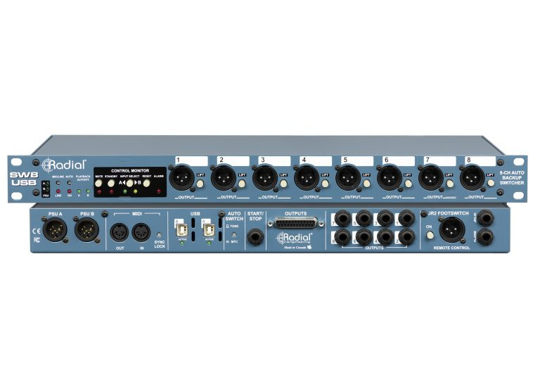 SW-8 USBSW8-USB to kompletne rozwiązanie do występów, które wykorzystują redundantne systemy odtwarzania podkładów muzycznych, łącząc dwa wbudowane interfejsy USB o wysokiej wydajności z funkcją automatycznego przełączania, która wykrywa przerwy i bez wysiłku przełącza się na komputer zapasowy w jednej chwili. Podwójne wejścia USB z oddzielnymi konwerterami 24bit / 192kHz pozwalają na połączenie dwóch komputerów w tandemie, więc cyfrowe stacje robocze na obu maszynach mogą łączyć się z SW8-USB jako interfejs audio i MIDI. Synchronizacja start / stop jest również możliwa między obydwoma komputerami poprzez MTC, zapewniając bezbłędne przełączanie między platformami odtwarzającymi przy użyciu mniejszej ilości sprzętu niż kiedykolwiek.