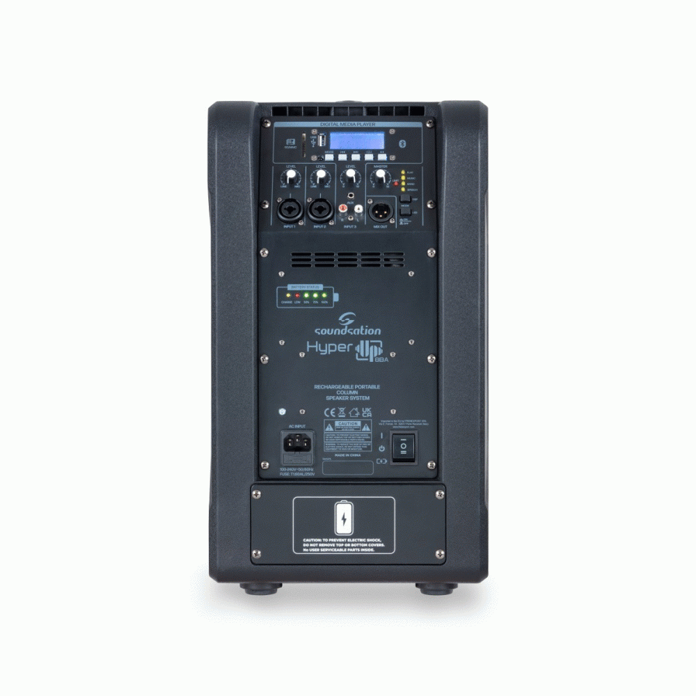 Regulatory: 2x poziom Mic/Line, poziom Aux In (Aux/BT/USB/SD), przyciski odtwarzacza multimedialnego, poziom Master, DSP Preset, dioda LED na froncie, wskaźnik LED stanu akumulatora